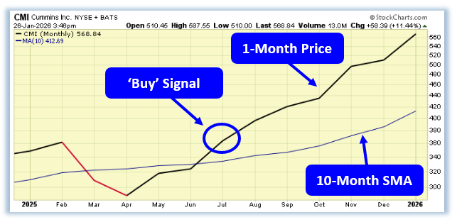 One name that fit squarely into that leadership profile was Cummins Inc. (CMI). The stock’s 1-month price remains firmly above its 10-month simple moving average, confirming a PowerTrend Buy signal that has been intact since the original crossover back in July ’25. That combination points to a sustained, higher-timeframe uptrend where pullbacks have tended to resolve higher rather than unwind. From a trader’s perspective, it’s the type of structure that rewards patience and disciplined positioning.