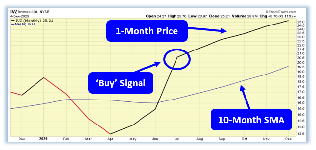 Today’s spotlight lands squarely on Invesco (IVZ) — a name that’s been grinding higher with the kind of persistence you simply can’t ignore. What pushed it onto my screen this morning wasn’t just its powerful series of higher highs and higher lows, but something far more telling: IVZ’s 1-month price is now trading firmly above its 10-month SMA, triggering what I call a Powertrend Buy Signal. This is one of the most reliable long-term trend models in my entire playbook, and IVZ has been riding this signal since midsummer with impressive conviction. In a market full of fakeouts, noise, and short-lived bursts of momentum, this is the type of structural strength that separates durable trends from disposable rallies — and it’s exactly why IVZ earned today’s TOD feature.