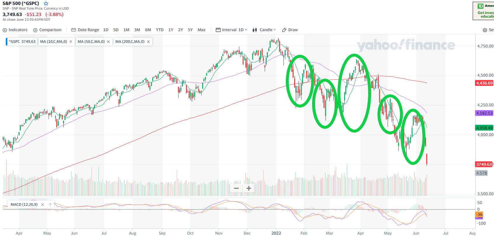 The green circles are all bounces as the markets have continued to drop. But as we pointed out in a recent article (read it here) don’t let that fool you. The long term trend is still down. We keep looking for a confirmation of the bottom. The next sign we will be watching to confirm the bottom will be a move above the 10 day moving average. If that gets confirmed by a curl up in the MACD and it crosses, then we will watch for the move above the 50. We saw all of these in March but the stronger the trend, the harder it will be to reverse it.