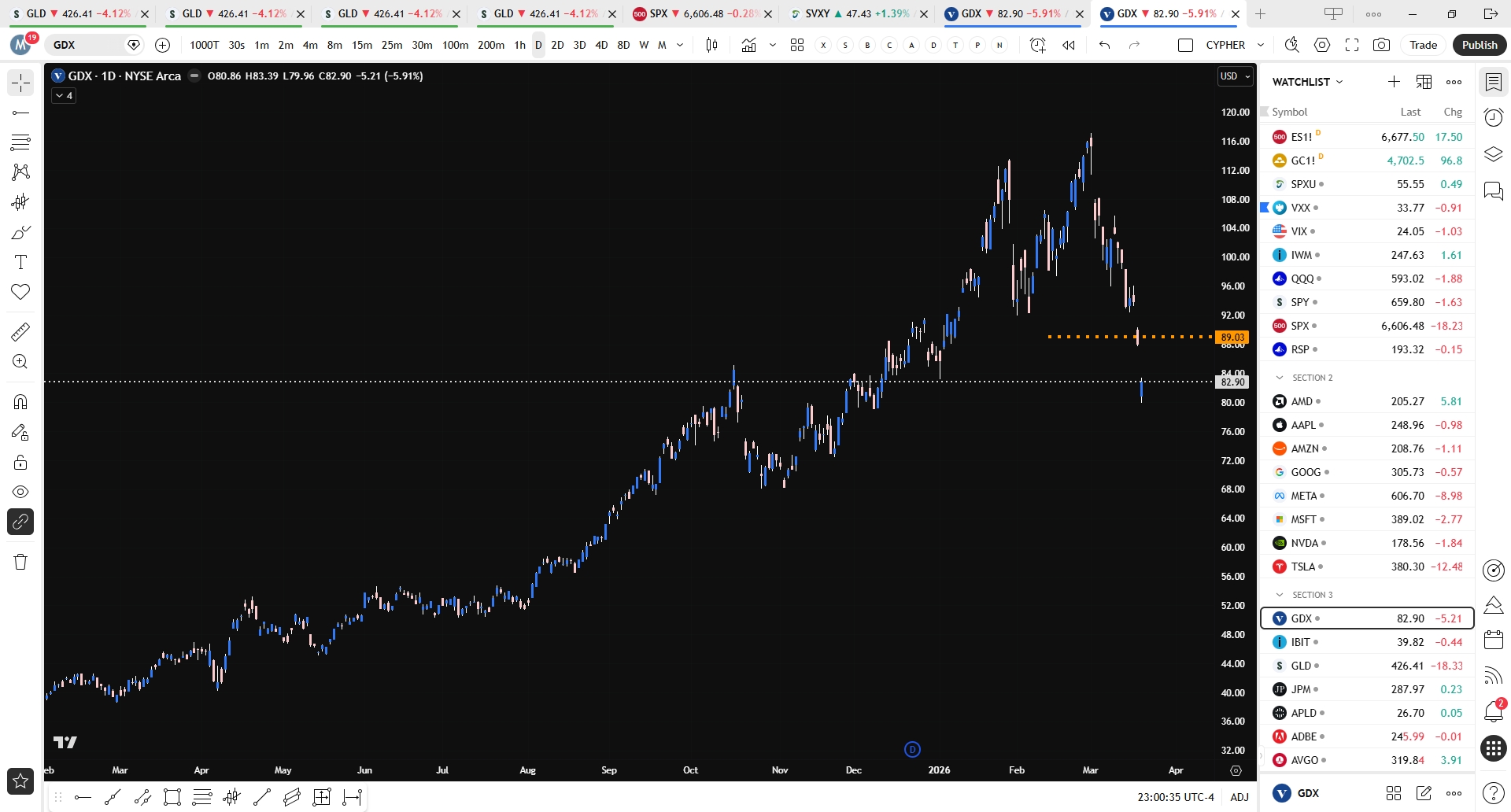 On the attached chart I am long GDX from 89 on Wednesday. The stock closed Thursday around 83, so a pretty severe one day haircut. However that knife can cut both ways, and I remain bullish on Gold and the gold miners. So look for a possible very quick recovery.