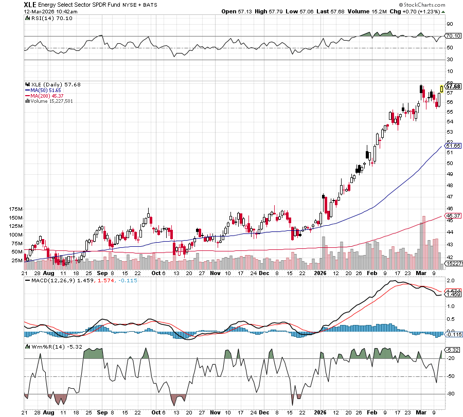 With an expense ratio of 0.09%, the XLE ETF provides exposure to companies in the oil, gas and consumable fuel, energy equipment and services industries, as noted by State Street SPDR. Since February 20, the XLE ETF ran from about $54.50 to a high of $57.88 so far.