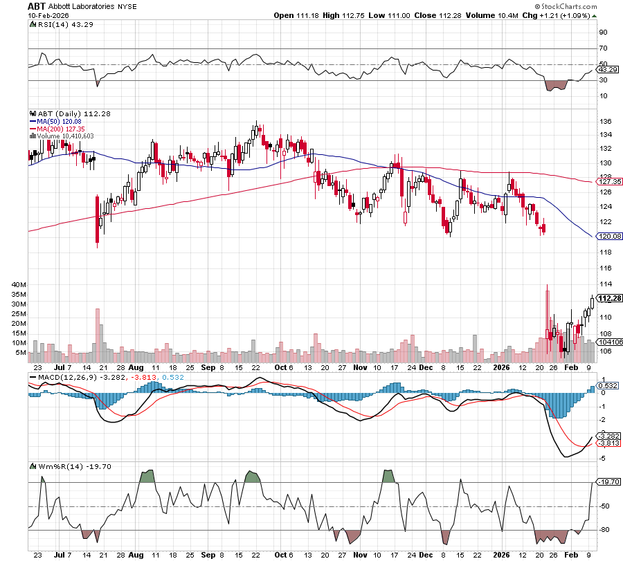 Abbott Laboratories (ABT) was crushed after its latest earnings report. In fact, it had its worst showing in more than 20 years, gapping from about $120 to $105.60.