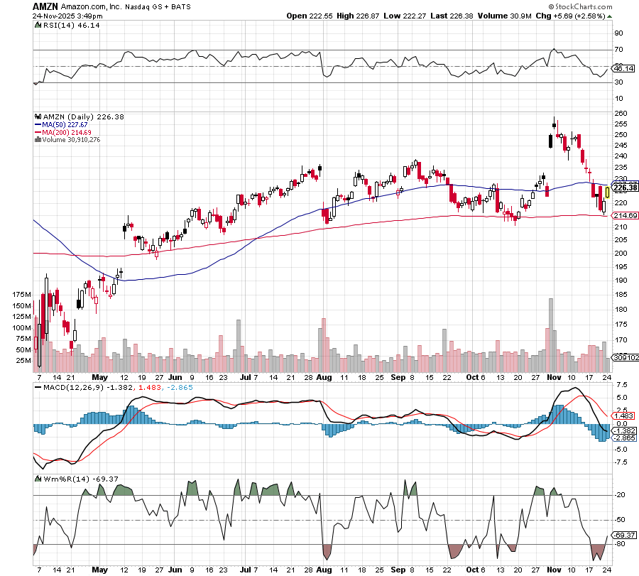 AMZN also just caught strong support at its 200-day moving average and is just starting to pivot higher. It’s also pivoting from overextensions on RSI, MACD, and Williams’ %R. We’d like to see AMZN retest $240 initially heading into the holiday season.