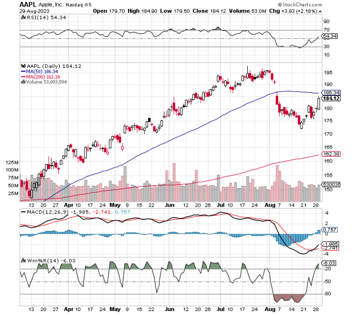 After getting knocked down on earnings, Apple (AAPL) has become severely oversold. From a current price of $182.80, it’s just starting to recover from over-extensions on RSI, MACD, and Williams’ %R. From here, we’d like to see the tech stock refill its bearish gap around $195, near-term.