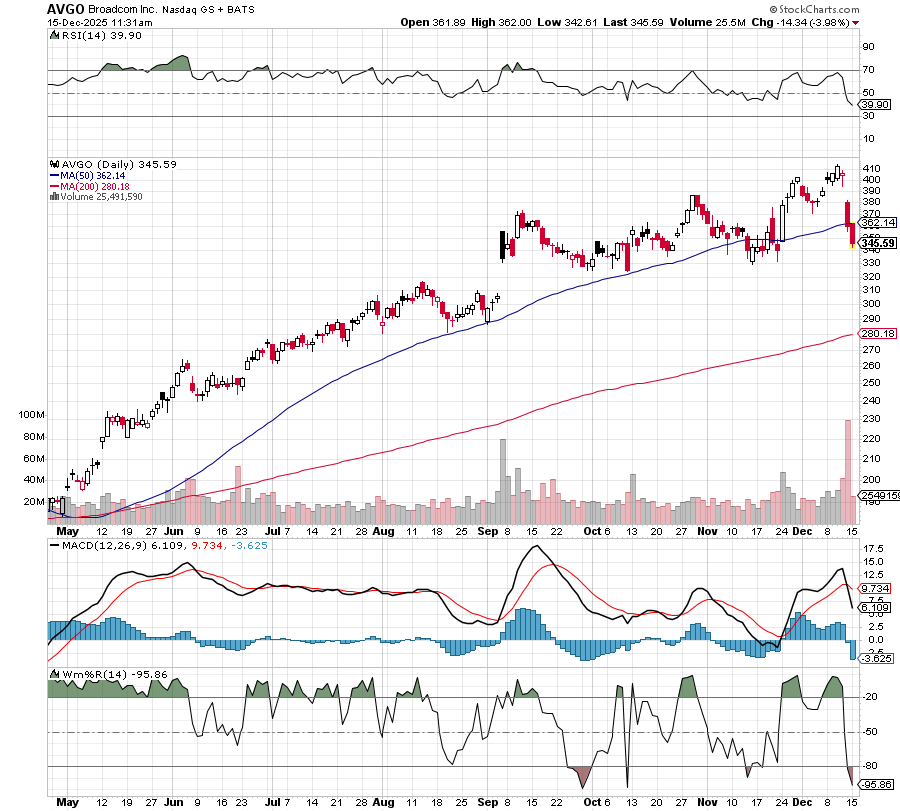 Broadcom posted strong earnings and gave a strong forecast. Unfortunately, the stock fell “after the chipmaker warned growing sales of lower-margin custom AI processors were squeezing profitability, sparking worries that the business may be less lucrative,” as noted by Reuters. “The warning on margin impact deepened investor jitters over Big Tech’s AI returns, a day after Oracle fell 10.8%.”