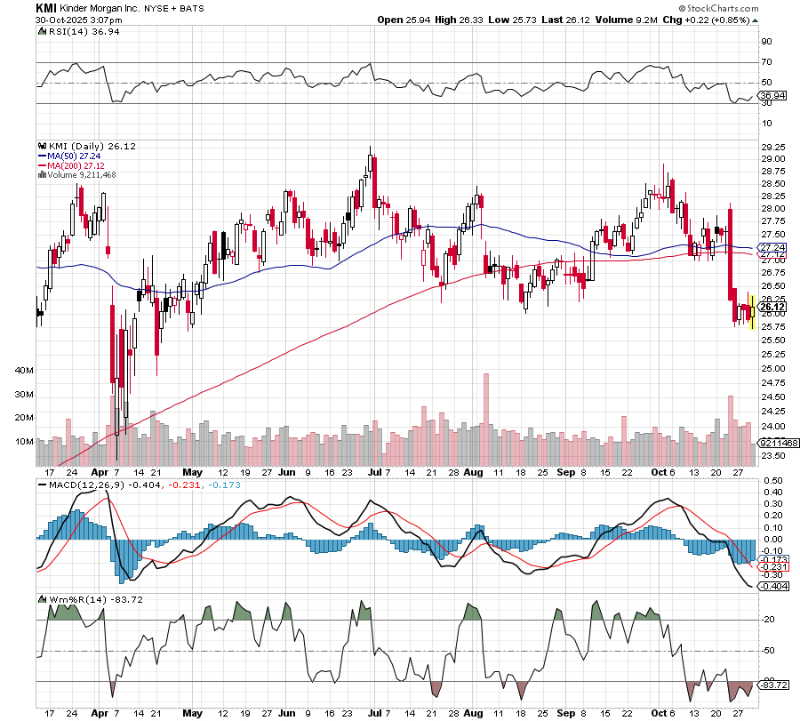 After dropping from about $28.91 to a low of $25.74, Kinder Morgan (KMI) appears to have caught strong support. Slowly pivoting higher, we’d like to see KMI retest $28.91 initially.