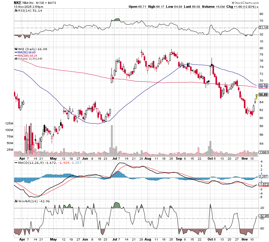 After catching support around $60, it’s also starting to pivot from overextensions in RSI, MACD, and Williams’ %R. From its last traded price of $64.20, we’d like to see Nike closer to $70 initially.