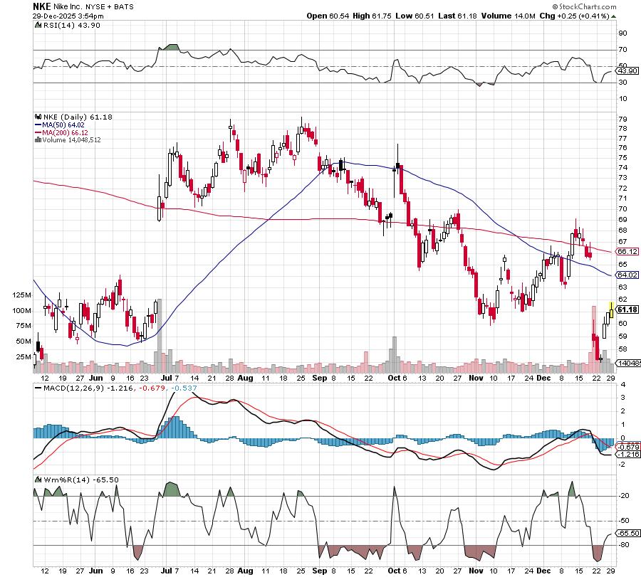 Nike dropped from about $69 to a low of $56.99 on weak China sales, declining gross margins, and a cautious outlook.