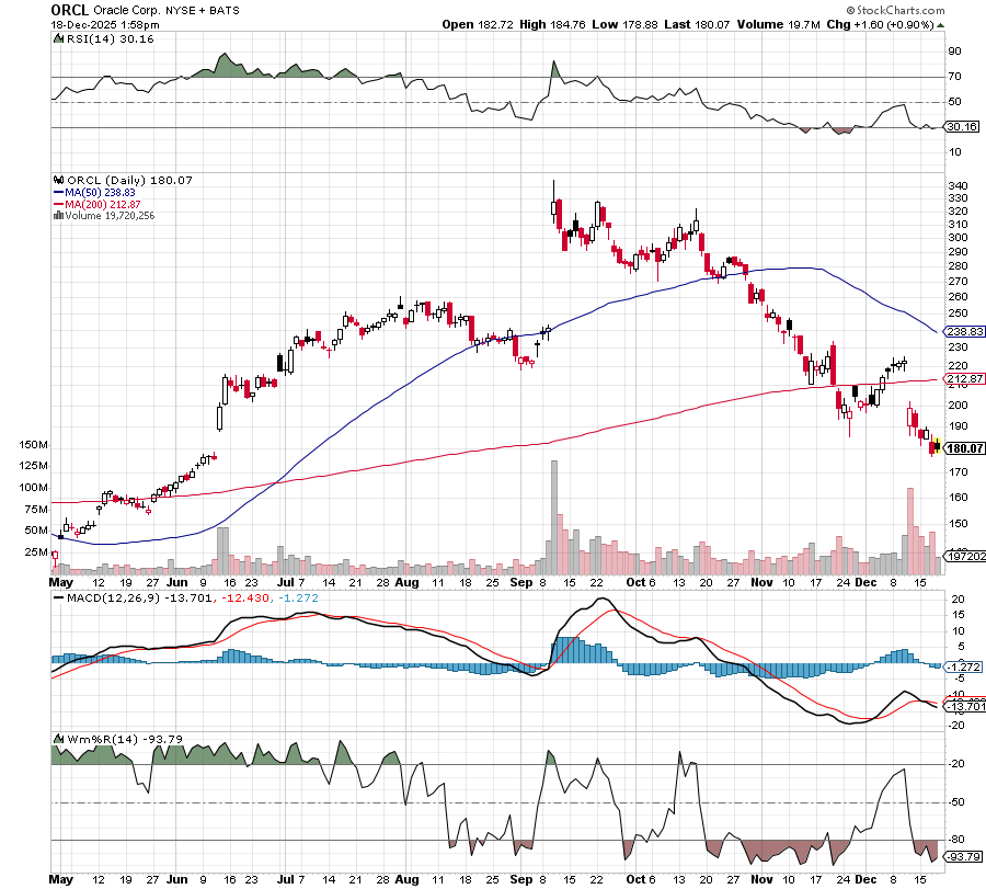 After gapping lower on AI data center spending fears, Oracle appears to have caught strong support at $188.65. It’s also overextended on RSI, MACD, and Williams’ %R. From here, we’d like to see ORCL initially refill its bearish gap at around $220 a share. Longer-term, we’d like to see ORCL retest $260 a share.