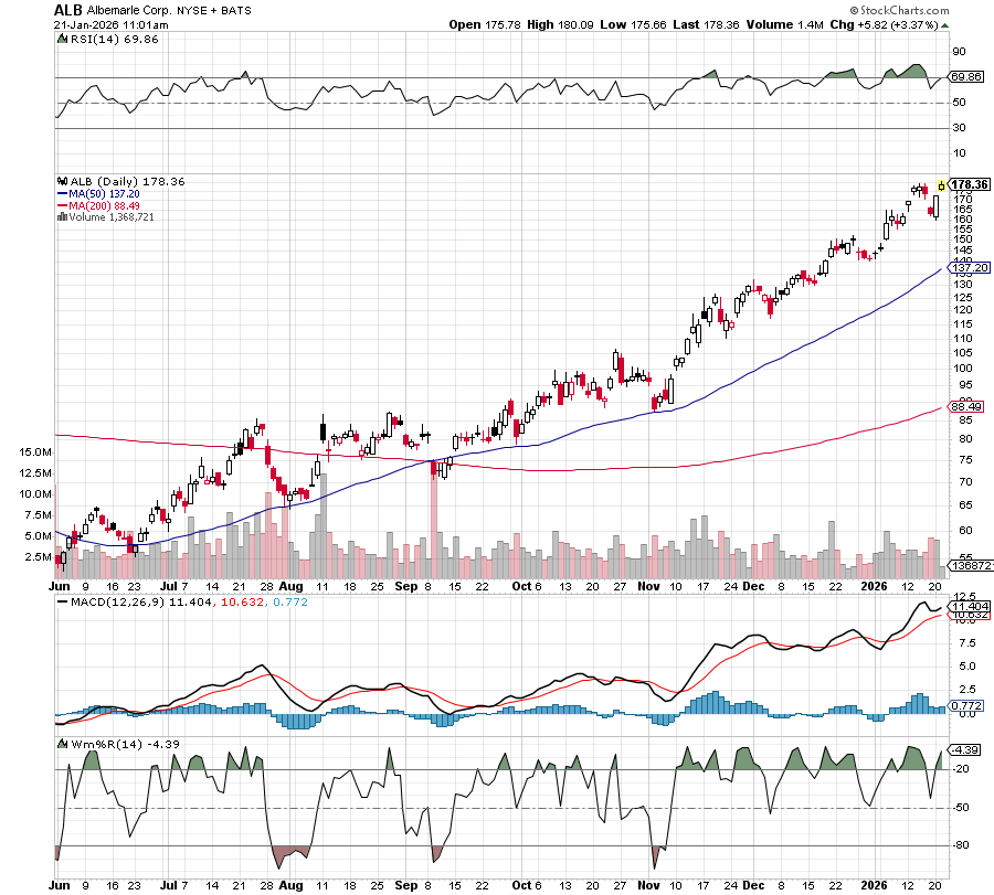 From its current price of $179, we’d like to see ALB challenge $200 near term.
