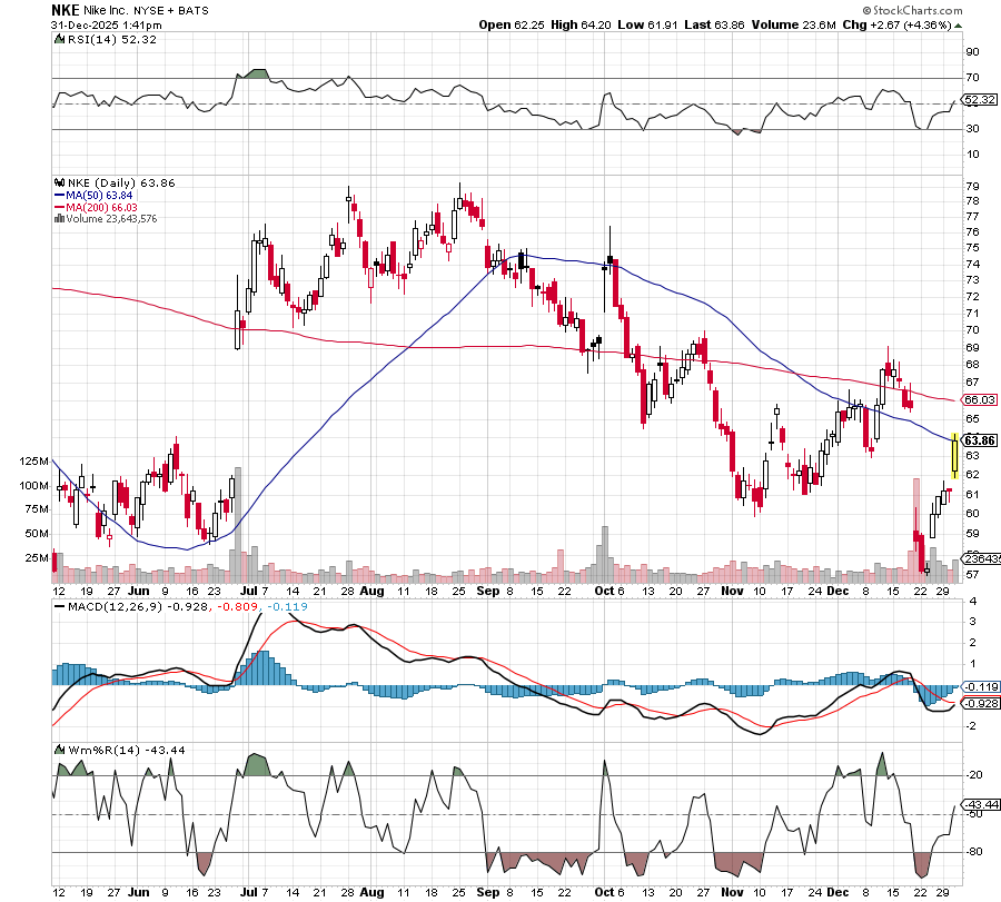 Robert Swan, another Nike director, purchased approximately $500,000 of stock on December 22 at an average price of $57.54. The stock is now seeing even more upside on news that Nike CEO Elliott Hill bought 16,400 shares for about $1 million. That follows Nike’s struggles with China sales, declining gross margins, and a cautious outlook.