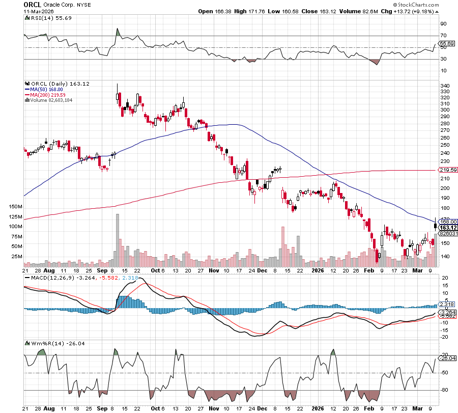 On February 25, we noted, “After seeing Oracle catch strong double bottom support at around $140, we’d like to see it retest $175 initially. Also, while we wait for ORCL to recover lost ground, we can collect its dividend.  Oracle (has maintained a consistent record of dividend payments. In March 2025, the Board declared a 25% increase, raising the quarterly dividend to 50 cents per share. The most recent dividend, was paid on January 23.”