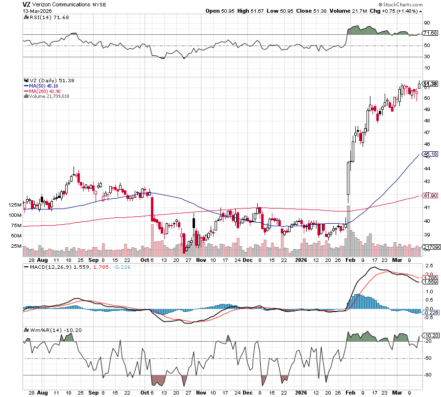 Helping, analysts at Raymond James raised its price target on Verizon to $56 from $50 with an outperform rating. Analysts at Scotiabank also upgraded Verizon to sector outperform from sector perform with a price target of $54.50 a share from $50.25 a share, citing cost cutting.