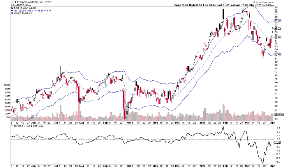 Freeport-McMoRan (FCX) is attempting to stabilize after a sharp pullback from recent highs, with price rebounding off the lower Keltner Channel and moving back toward the midline. The recent decline pushed price to the lower end of its range, but the Ease of Movement (EMV) indicator shows a sharp recovery from deeply negative levels, suggesting that downward pressure is easing and buyers are able to move price more efficiently to the upside.