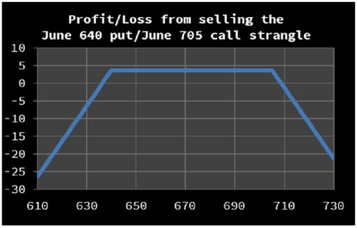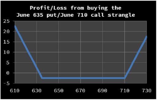We’ve already looked at the options we’d be selling as part of the credit spread combination. Now let’s look at the options we’d be purchasing as part of the total transaction. As noted, we’re buying the 710 call and buying the 635 put for a total of 2.50 ($250). Remember, when you buy an out-of-the-money call and put at the same time, you are long a strangle.