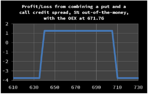 Now let’s look at the trade using credit spreads. It is May option expiration; we are looking for a trade with an 80% probability of profit. We want to sell a call that is 5% above the current market price (with the OEX at 671.76, 5% above is 705.35) and simultaneously buy a call one strike price further out-of-the-money. Also, at the same time that we want to sell a put that is 5% below the current price (638.17), we want to buy one put one strike price further out-of-the-money. The call we want to sell is the 705 call priced at 1.75 ($175). The call we want to buy is the 710, priced at 1.25 ($125). The put we want to sell is the 640 priced at 2 ($200). The put we want to buy is the 635 priced at 1.25 ($125).