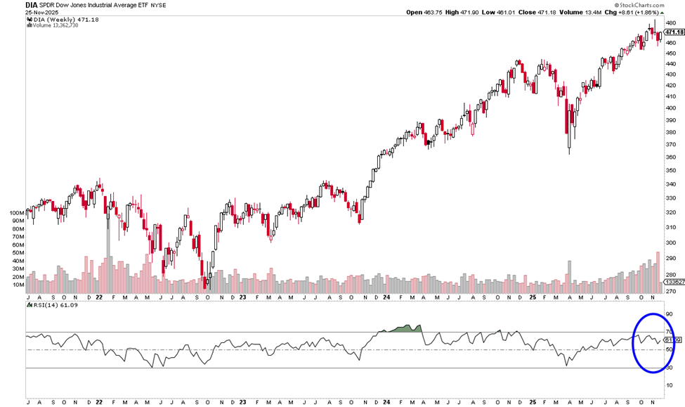 The RSI is above the dashed line is telling us there is strength to the UPSIDE. A great potential trade here is to buy a CALL option. If DIA hits $472.00 it is a sign to take the trade. Be sure to select an expiration that is far enough out to allow the move to happen.