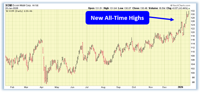 That stock is Exxon Mobil (XOM), and its recent price action is turning heads across the market. After spending years digesting gains and building a broad, multi-year base, XOM has now emerged into open air, breaking out to a fresh string of all-time highs in a way that feels both decisive and orderly. This isn’t a fleeting pop or a one-day wonder—each advance has been met with follow-through, reinforcing the sense that buyers remain firmly in control. When a stock of this size and history starts behaving like this, it often signals that a new chapter is unfolding rather than the end of a move.