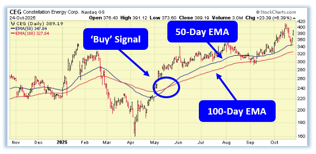 The company helping to power this AI revolution is Constellation Energy Corp. (CEG) — and right now, it’s firing on all cylinders. After an impressive run over the past several months, shares have not only held their gains but appear to be gathering fresh momentum. What really caught my eye today, however, was a decisive technical confirmation: the 50-day EMA is above the 100-day EMA, a classic “buy” signal that often marks the beginning of a sustained leg higher. Combine that with the stock trading firmly above both moving averages, and you have a textbook example of a market leader in a confirmed uptrend — the kind of setup that doesn’t just suggest strength, but momentum with conviction.