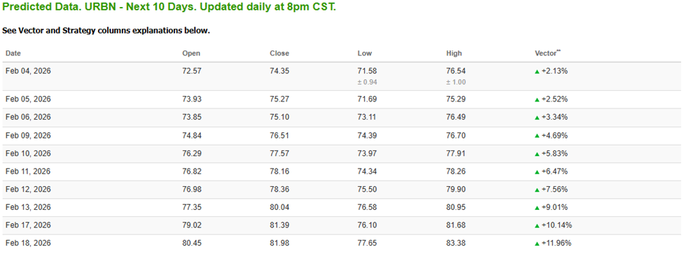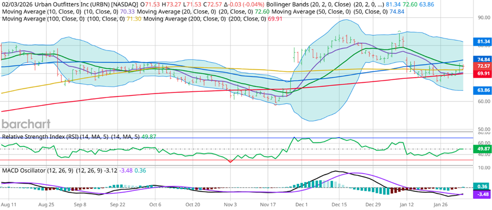For example, the February 20th $74 calls are currently trading around $2.10, and if URBN rallies to $80, they’d be worth $6.00 or more, so there’s some serious upside here with possible returns around 350% if we reach the target high of $83.38, as the calls would be worth around $9.40 in that scenario!