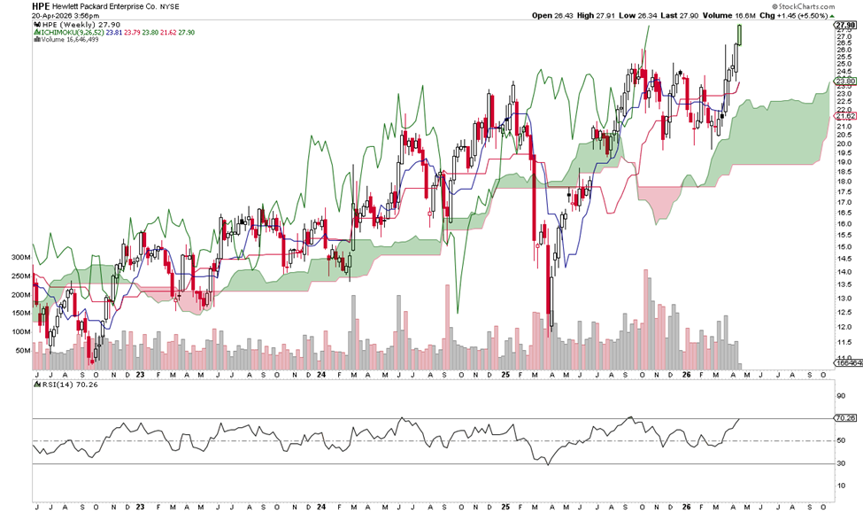 Expanding volume adds credibility to the breakout. RSI has moved above 70, signaling strong buying pressure, though the stock may be stretched short term. As long as HPE holds above prior breakout levels and the Ichimoku Cloud remains supportive, the path of least resistance appears higher.