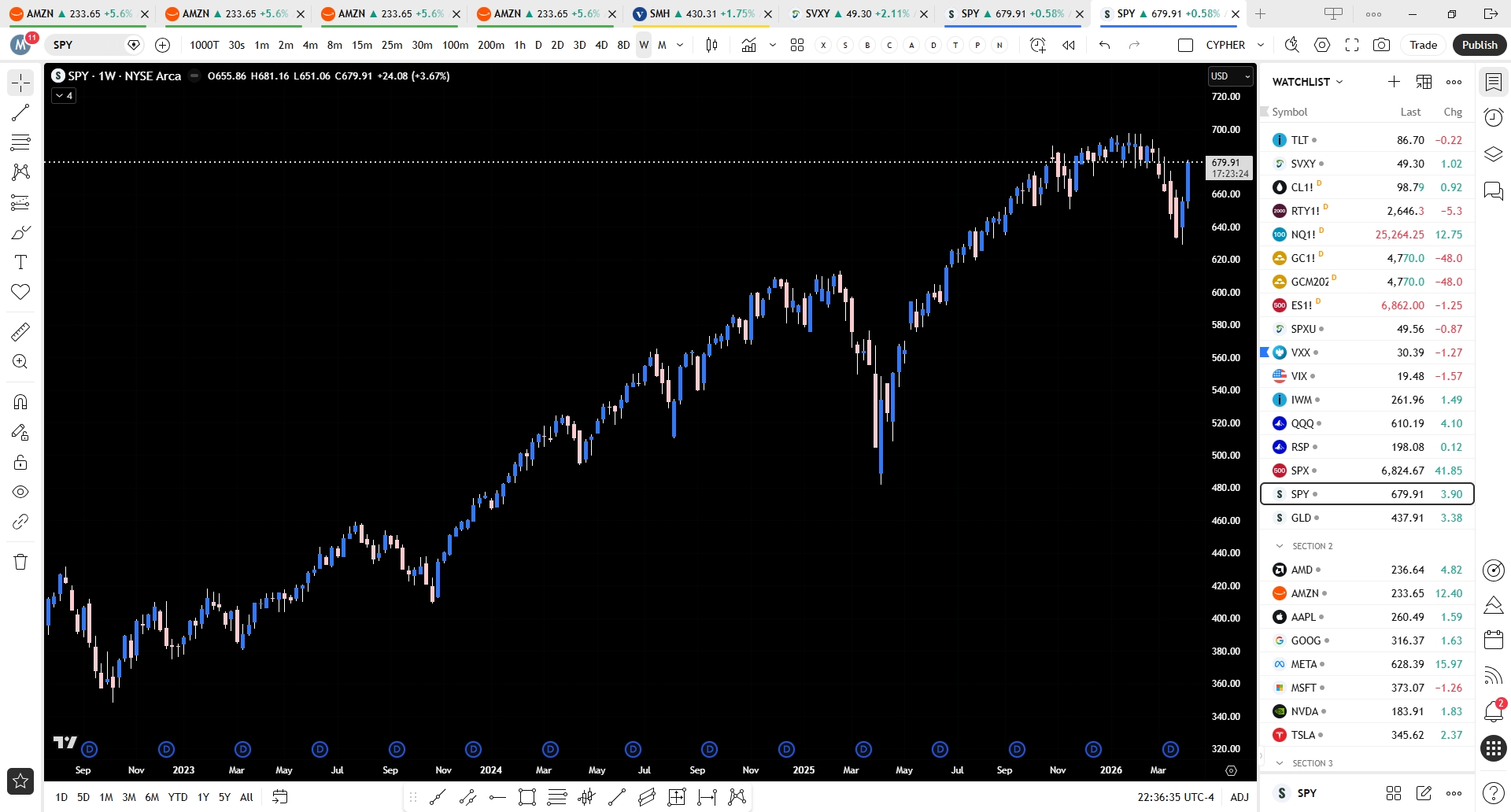 If anything, shorts are well squeezed and it looks to me like the downside is once again the way I would bet. Take a look at the SPY weekly chart attached. One does not need to be a CFA to scratch one’s head that there seems to be a disconnect between price and world events.