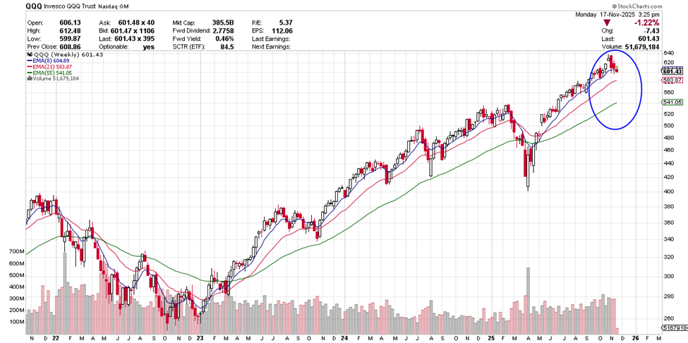 Here is a chart of QQQ, the tech ETF, and I am specifically looking at the EMAs. The EMAs on the chart below are represented by the colored lines: