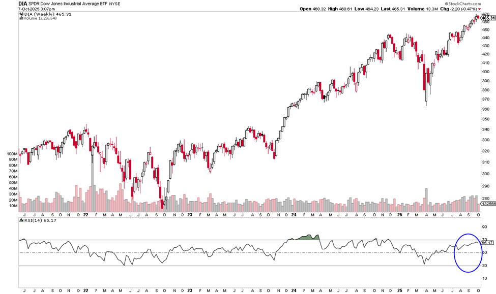 The RSI is turning down toward the dashed line is telling us there is strength to the DOWNSIDE. A great potential trade here is to buy a PUT option. If DIA hits $465.00 it is a sign to take the trade. Be sure to select an expiration that is far enough out to allow the move to happen.