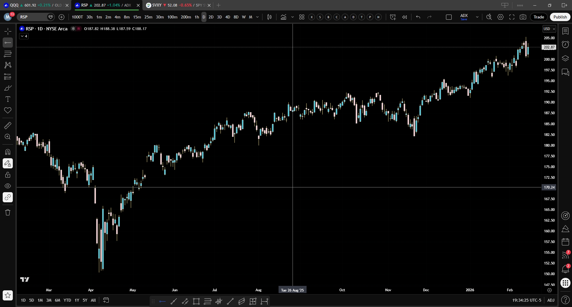 Last chart I will leave you with is the unweighted SP 500. This gives equal weight to all 500 stocks in the index. It was making new highs everyday last week! So I remain looking for longs, not shorts. Bullish on 2026, but not committing to specific longs just yet with exception of a dated call option on IWM.