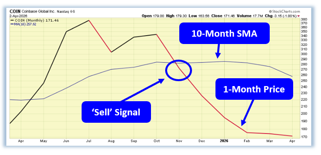 Participation across more speculative pockets of the market and crypto-linked names has continued to erode, with rallies fading quickly and sellers maintaining control of the trend. Coinbase (COIN) has been a clear reflection of that pressure, rolling over after a mid-2025 peak and establishing a persistent sequence of lower highs and lower lows since October. The more telling shift occurred in November, when its 1-month price closed below the 10-month moving average, triggering a PowerTrend ‘Sell’ signal that remains firmly in place today. Since then, each bounce has been met with profit taking, reinforcing a tape that continues to favor downside continuation over sustained recovery.
