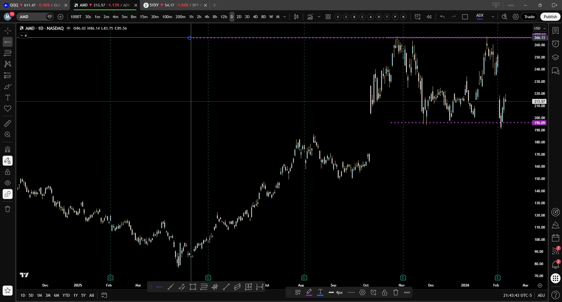 Lots of similar patterns to AMD attached. A flat sideways correction, break the lows and reject back higher.