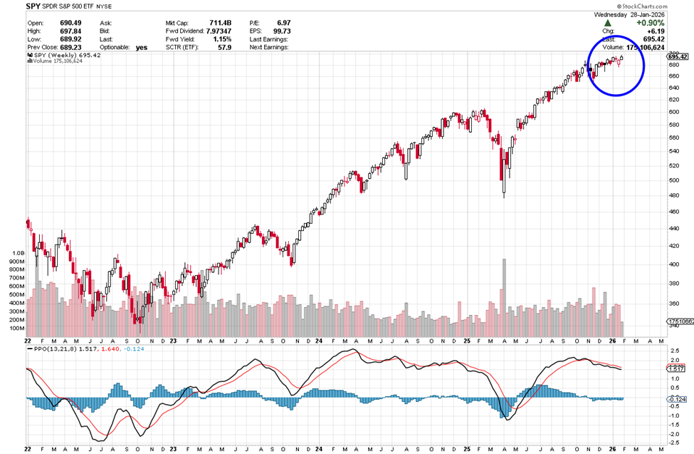 The red line of the PPO is ABOVE the black line indicating BEARISH momentum. We will look at buying PUTS.
