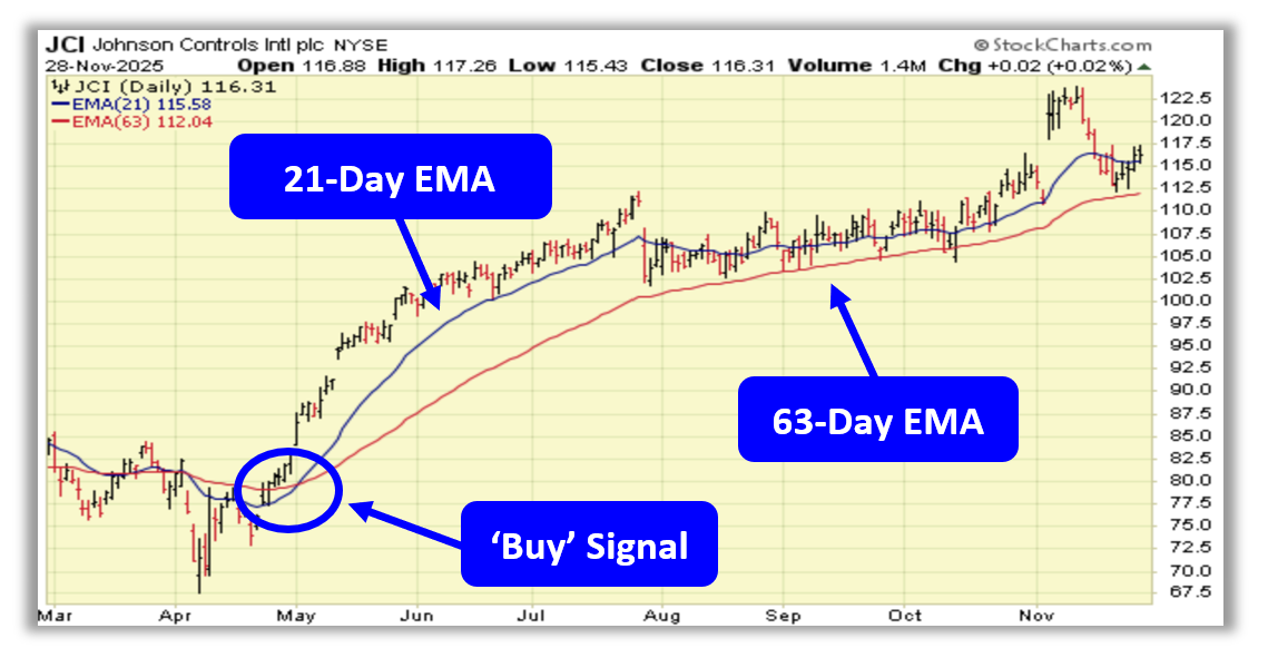 Johnson Controls (JCI) is beginning to reestablish its footing in the industrial space, supported by improving order trends and a tighter technical picture. What grabbed my attention today is a momentum signal I rarely overlook: the 21-day EMA has crossed above the 63-day EMA. That shorter-term trend line overtaking the intermediate one is often an early tell that real buying pressure is returning. And it’s showing up just as the stock is carving out firmer swing lows and trading with noticeably stronger consistency — signs that institutional interest may be quietly rebuilding. When a company at the center of building efficiency and automation starts flashing both structural progress and a fresh momentum confirmation, Johnson Controls becomes a name bullish traders don’t want to sleep on.