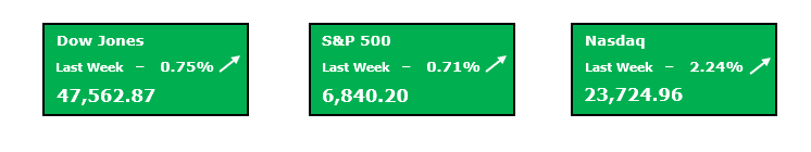 Just as we highlighted in last week’s edition, the major market drivers were the wave of mega-cap earnings and the much-anticipated Fed meeting. On the earnings front, results came in strong across the board, with the biggest tech names delivering “double beats” on both the top and bottom lines. Yet, stock reactions were far from uniform. Some companies faced investor pushback over rising expenses and accelerating capital spending, while others were rewarded for disciplined execution. Meanwhile, the Fed cut rates by 25 basis points — a widely expected move that had been priced in well ahead of the announcement. What truly moved markets, however, was Chair Powell’s notably hawkish tone during the press conference, where he cast doubt on whether another cut would come at the December meeting. The tone appeared intentional, aiming to temper market optimism after a strong summer rally. Despite a volatile week of back-and-forth trading, the S&P 500, Dow, and Nasdaq all finished higher, each closing at fresh all-time highs and extending their powerful multi-week run.