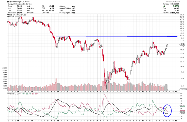 Schlumberger (SLB) last week was up, suggesting it may continue its upward bias. It appears to be ready to head higher and have the ADX turn up further, if this continues, the pattern should remain intact as price keeps rising. Notice the +DI is heading up and is above the -DI line on the chart above. We want the +DI to stay above the -DI (green line above red) to consider a trade.