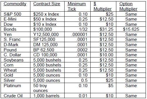 One of the more confusing aspects to commodity trading is that they all have different values. This is particularly true with the bond contract and its option, both of which have different tick and dollar values. Below you will find just a few of the more widely traded contract specifications. You should always ask your broker for the current margin requirements for a given commodity, as well as a given trade, since the margin requirements change with market conditions. All quotes below are the courtesy of CQG, Inc, a commodity and stock quote vendor.