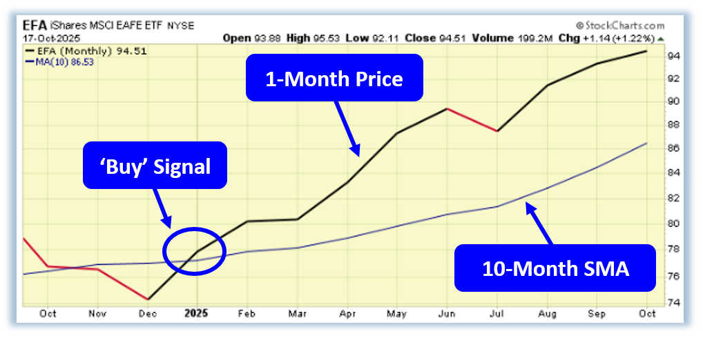 The ETF in my focus today is the iShares MSCI EAFE ETF (EFA) — a benchmark tracking some of the world’s most developed markets outside the U.S. And right now, it’s firing on all cylinders. After months of steady momentum, EFA has officially triggered one of my favorite long-term confirmation tools — the “PowerTrend” Buy signal — with its 1-Month Price now trading firmly above the 10-Month SMA. This is the kind of crossover that often marks the start of durable, sustained uptrends rather than the tail end of one. The initial shift in momentum began back in January, but what we’re seeing now is clear evidence that the bulls have seized control and aren’t looking back. With trendlines aligned, strength broadening, and price action clearly moving higher, EFA’s chart is sending one unmistakable message: this breakout is likely not done yet.