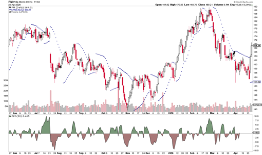 PM bounced sharply today after an extended pullback, gaining more than 3% as buyers stepped in near recent support. The Parabolic SAR (blue dots) has remained above price during the decline, signaling the short-term downtrend is still in place, but today’s strong candle suggests that pressure may be easing.