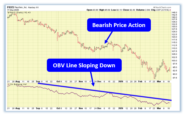One name that surfaced in today’s review is Paychex (PAYX). The backdrop is challenging: a stalled “no hire, no fire” labor environment now showing early signs of contraction, paired with longer-term concerns around AI-driven disruption in payroll and HR services. Price has reflected that pressure, carving out a steady sequence of lower highs and lower lows since its June peak, with little evidence of sustained buying interest. More telling is the OBV line, which has continued to drift lower throughout the decline and barely responded during recent rallies—suggesting institutions have yet to step in with conviction.