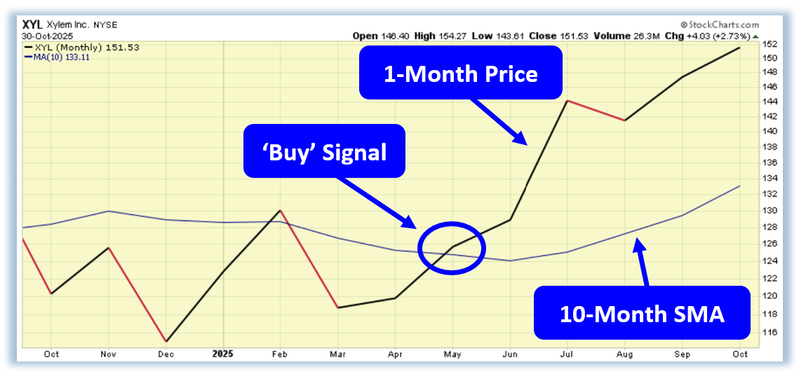 The stock pushing to the top of my ‘Buy List’ today is Xylem Inc. (XYL) — and right now, it’s one of the most compelling trend stories in the entire industrial sector. Shares have been in a steady, disciplined uptrend, carving out a textbook series of higher highs and higher lows as the market continues to reward its leadership in smart water solutions and sustainable infrastructure. What truly caught my attention with XYL, however, was the confirmation of a PowerTrend “Buy” signal — triggered when its 1-Month price pushed above the 10-Month SMA, a move that’s been active since May and continues to validate the stock’s longer-term strength. This signal is one of my favorites because it doesn’t just identify momentum — it confirms sustained trend integrity. When a stock is holding this kind of technical footing while its industry tailwinds strengthen, it’s a setup that deserves every trader’s attention.