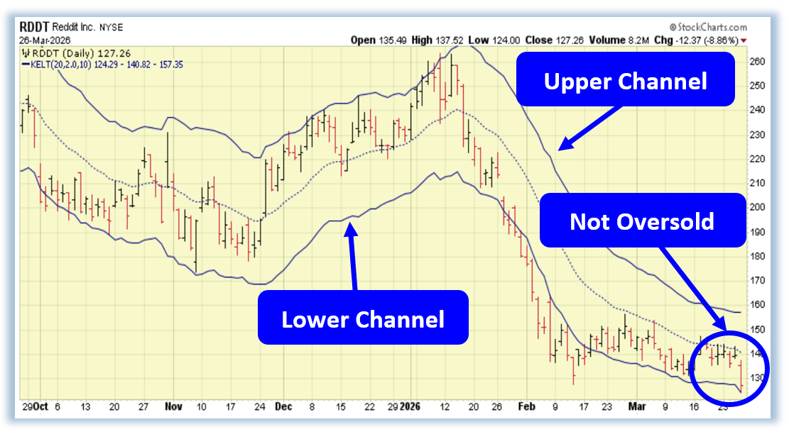 That brings us to Reddit Inc. (RDDT), which has been under sustained pressure since its September peak. The stock has materially underperformed year-to-date, accelerating lower through a sharp January–February decline before attempting — and failing — to establish a base. Today’s move stands out as price decisively broke a support level that had held for roughly a month, reinforcing the existing pattern of lower highs and lower lows. With shares trading below all major moving averages and still not registering as technically oversold based on Keltner Channels, the setup suggests downside momentum may not yet be exhausted.