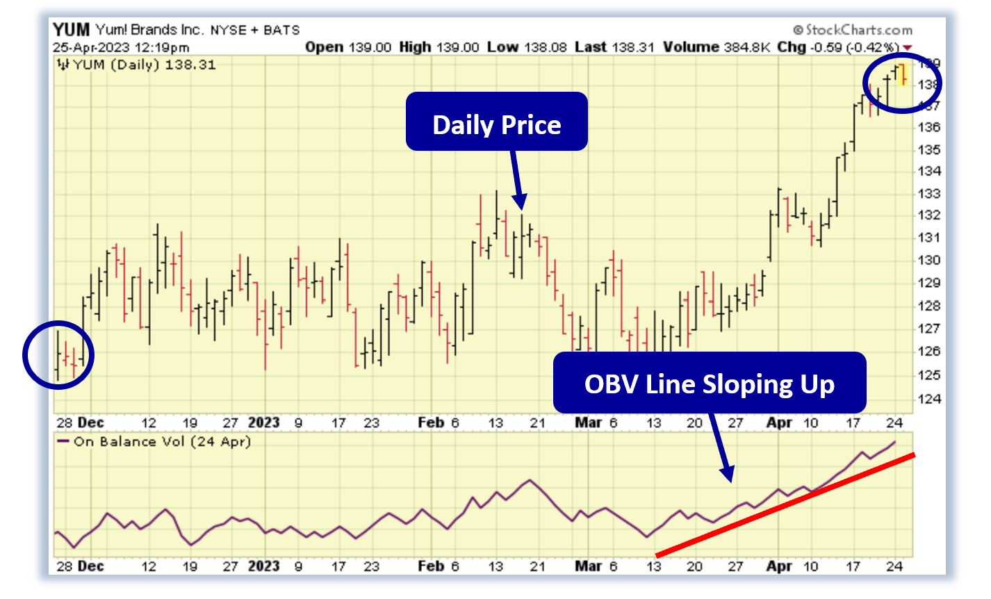 The YUM daily price chart below shows that YUM is in a price uptrend as the current price is above the price YUM traded at five months ago (circled). The On Balance Volume chart is below the daily chart.