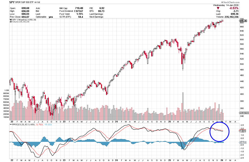 Next, we want to see where the momentum is to get a sense of the direction it will head next. As we look at the chart of the SPY below, pay attention to the Percentage Price Oscillator or PPO at the bottom of the chart. When the lines in the PPO cross it is a telling signal, we can use to find a trade. To get more information on the PPO, click here.
