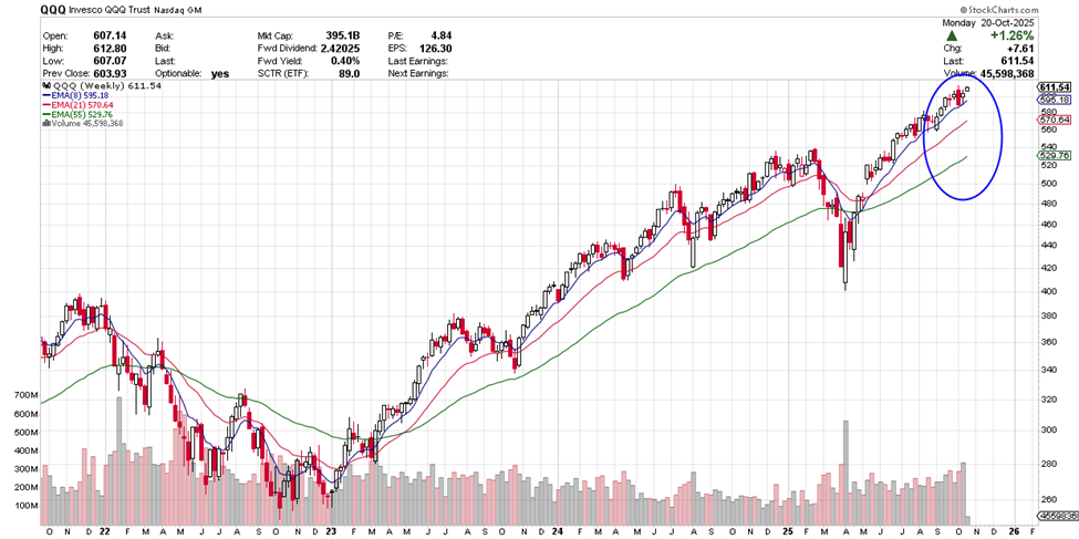 The next step for me is to look at a chart of QQQ that includes Fibonacci Exponential Moving Averages (EMA). This is an indicator that appears on the chart in colored lines and gives us a sense of the strength and direction of the current price movement. To learn more about EMAs, click here.