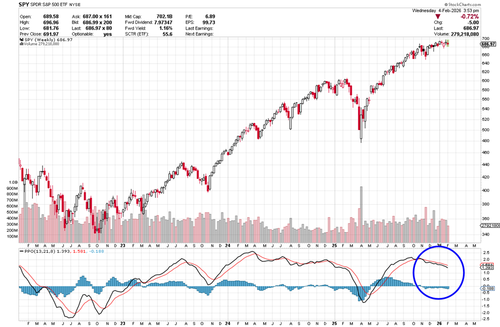 Next, we want to see where the momentum is to get a sense of the direction it will head next. As we look at the chart of the SPY below, pay attention to the Percentage Price Oscillator or PPO at the bottom of the chart. When the lines in the PPO cross it is a telling signal, we can use to find a trade. To get more information on the PPO, click here.