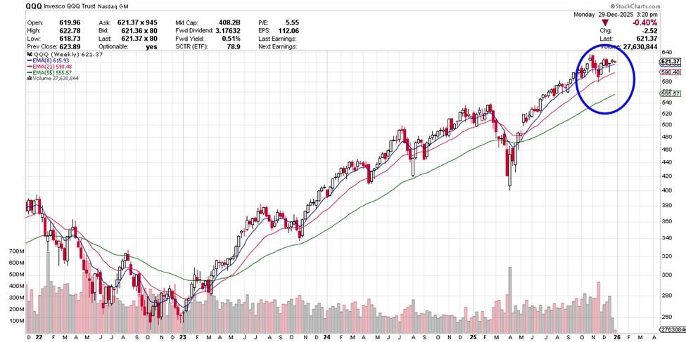 The next step for me is to look at a chart of QQQ that includes Fibonacci Exponential Moving Averages (EMA). This is an indicator that appears on the chart in colored lines and gives us a sense of the strength and direction of the current price movement. To learn more about EMAs, click here.