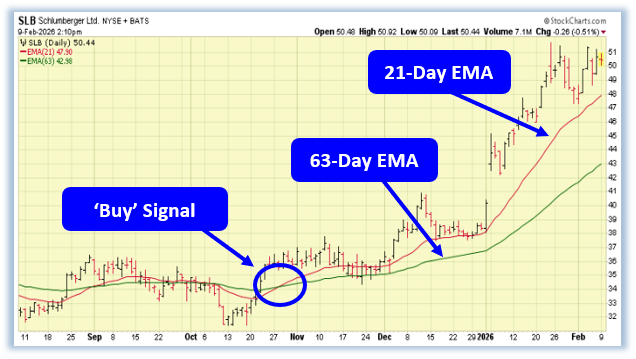 That behavior points to SLB (Schlumberger). Since last year’s Q4, the stock has been carving a clean series of higher highs and higher lows, and in late October its 21-day EMA crossed decisively above the 63-day EMA — a momentum inflection that has held rather than faded. Importantly, price now sits comfortably above both averages, suggesting the shorter-term trend is carrying the longer-term trend with it. In trader terms, it’s been a stair-step advance with participation instead of drift, the exact pattern we like to see in a price chart.