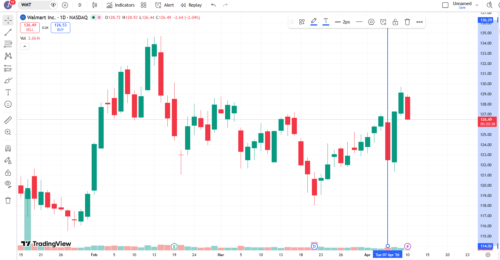 Following up on our post from Tuesday about a strong signal we saw in Walmart (WMT). It took a $2.88 position and sent it up to just over $4 in a day. Here is the previous post where the trade I found using Wendy Kirkland’s DNA Indicator helped me spot a the May 15 130 call for about $2.88. You can see on this chart that WMT climbed as expected:
