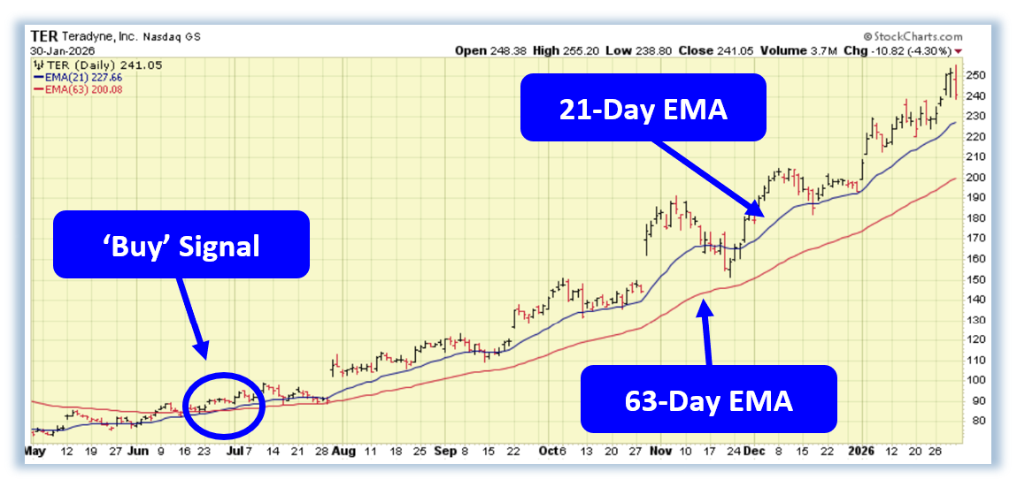 Teradyne (TER) stood out because its 21-day EMA has been holding cleanly above its 63-day EMA since the initial crossover back in June 2025 — a textbook sign that intermediate momentum has been in gear for months, not weeks. Price is now trading above both averages, which in practice means dips have been bought rather than broken. Instead of whipsaw, the chart has been doing what constructive trends are supposed to do: progress higher while keeping risk visually contained.