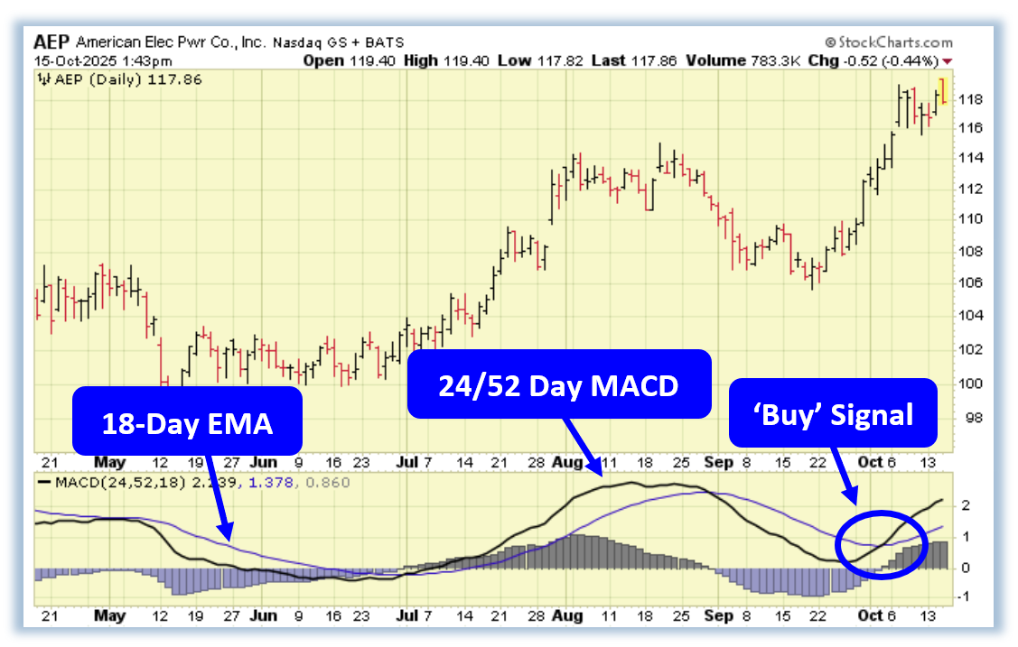 That standout name? American Electric Power Co. (AEP). Long known for its vast network delivering electricity across the heart of the U.S., AEP has quietly transformed into one of the most strategically positioned players in the new energy era. As AI data centers multiply and grid demand hits levels unseen in decades, AEP is benefiting from a powerful confluence of growth drivers—rising load requirements, multi-billion-dollar infrastructure upgrades, and surging capital investment across the sector. The company’s steady expansion in generation and transmission capacity has turned what was once a defensive utility play into a genuine growth story. And the market has noticed: shares are breaking out with authority, climbing above every major trendline on the chart and showing no signs of fatigue. Specifically, AEP’s 24/52 MACD is trading above the 18-Day EMA signaling a fresh acceleration higher, which landed AEP on my desk today. The message from the tape is clear—momentum is accelerating, and AEP’s move higher looks far from over.